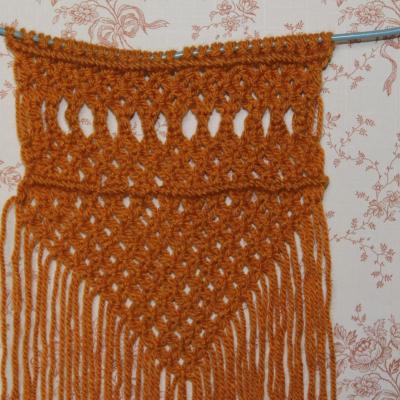 Attacher la première cordelette de 55 cm de part et d'autre sur le cintre: elle sert de porte-noeud et doit passer au-dessus de tous les autres brins. Nouer sur cette cordelette une baguette horizontale avec chacun des brins. Détacher ensuite la cordelette du cintre et cacher les extrémités du porte-noeud en passant celles-ci entre 2 noeuds au dos de l'ouvrage et couper.