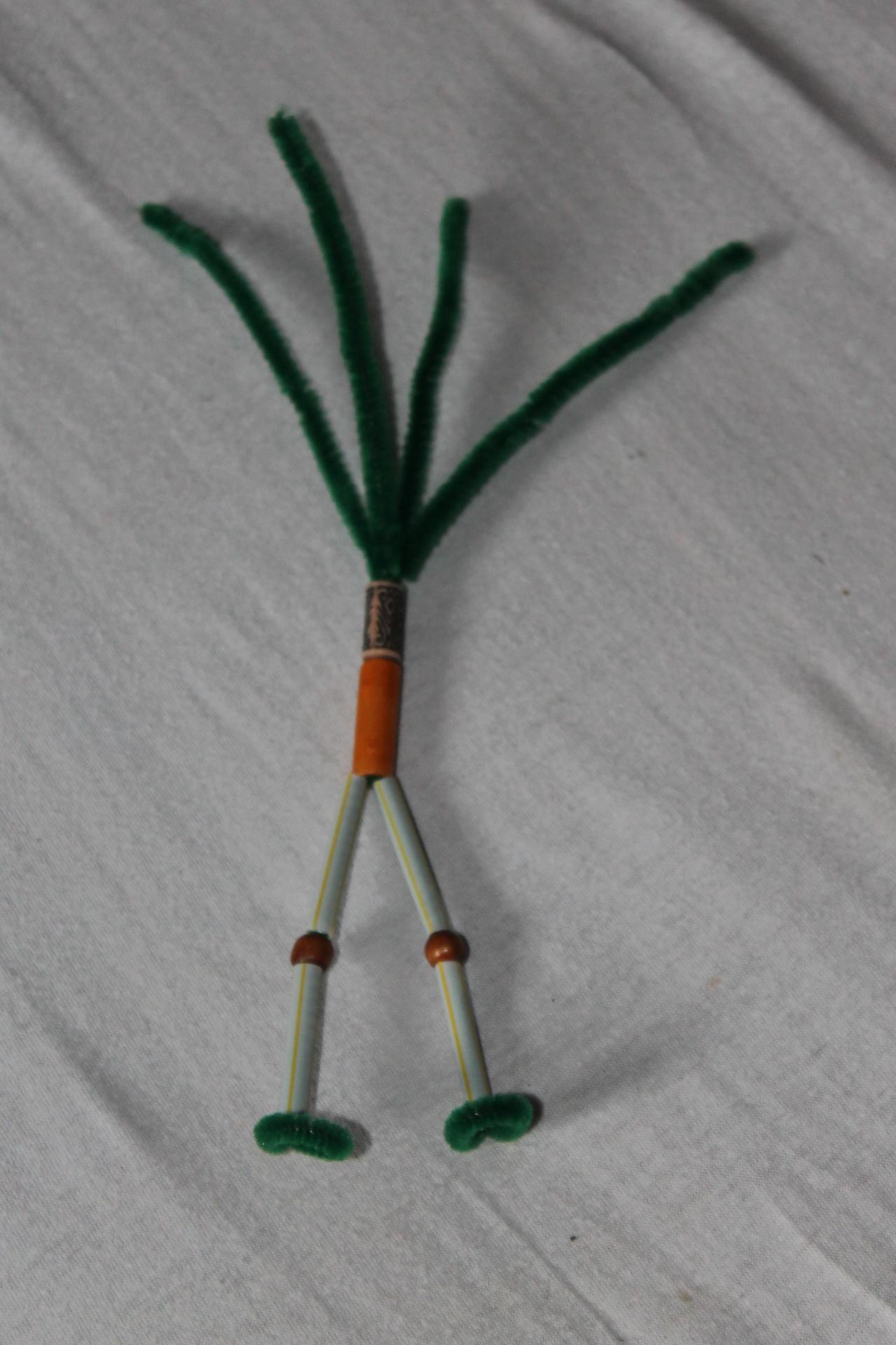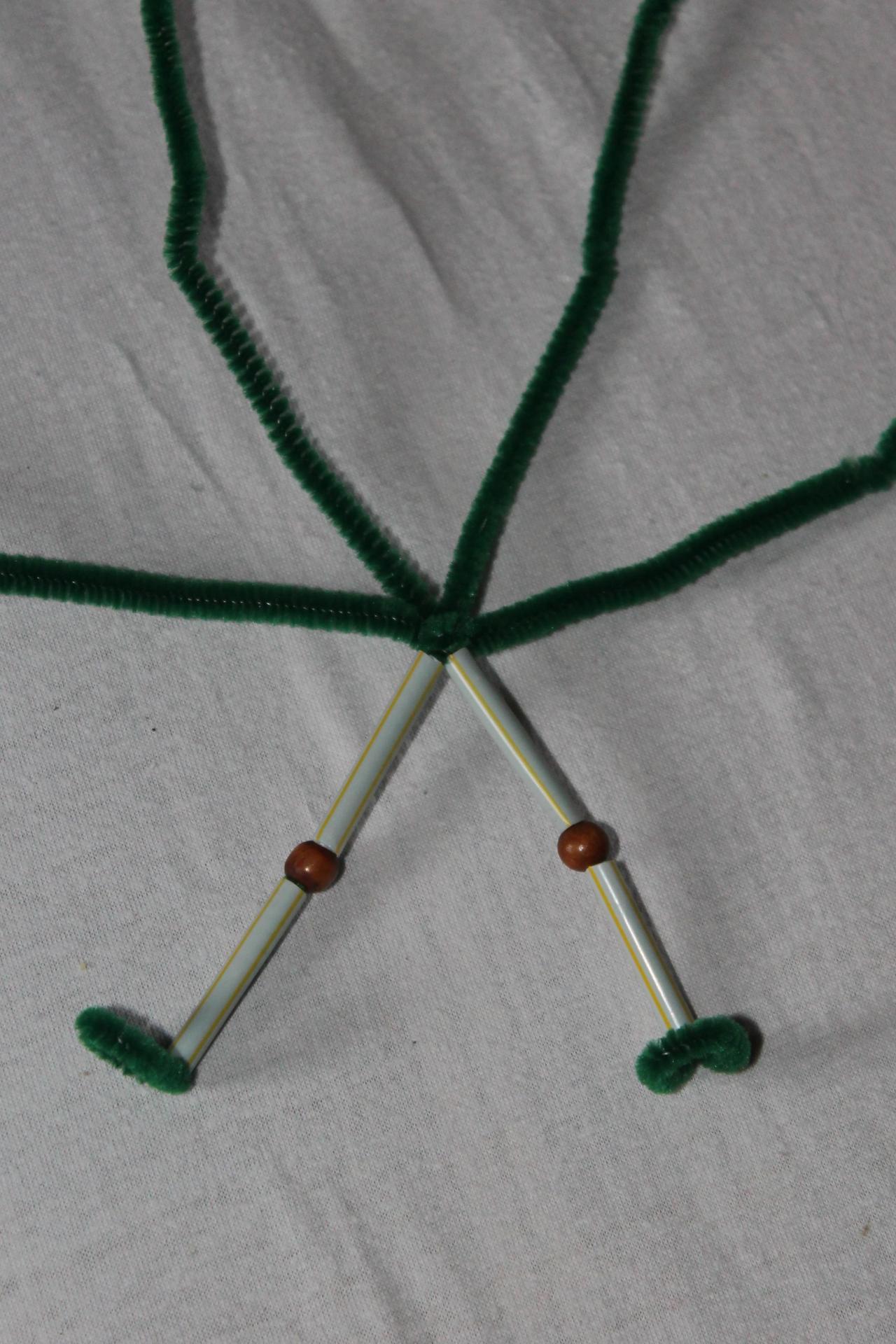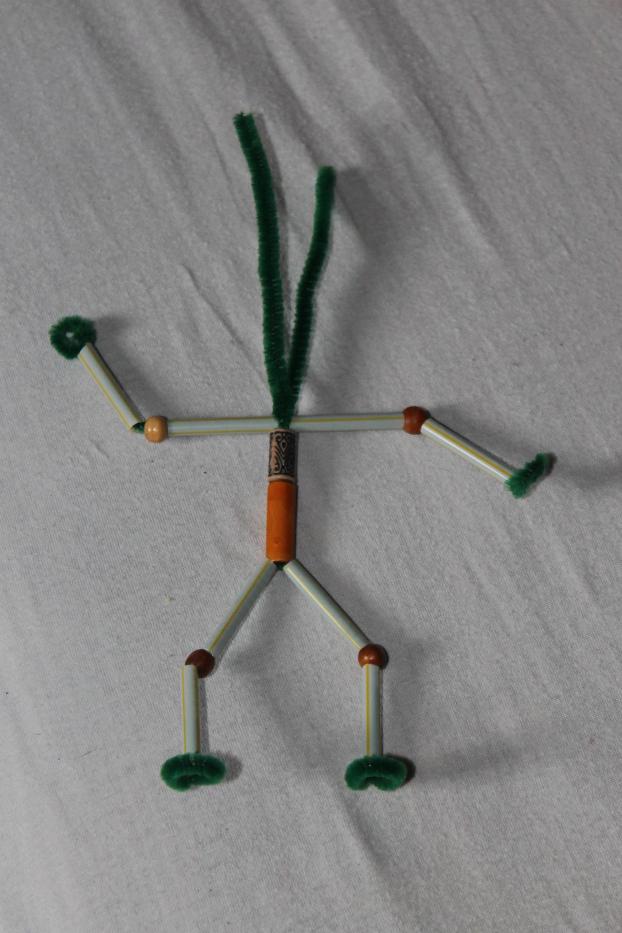 Couper 8 morceaux de pailles de 3,5 cm de longueur. Sur les deux "branches du bas", enfiler une paille, une perle en plastique puis une seconde paille. Placer l'extrémité de la chenille dans la paille puis faire une boucle afin de former le pied du personnage.