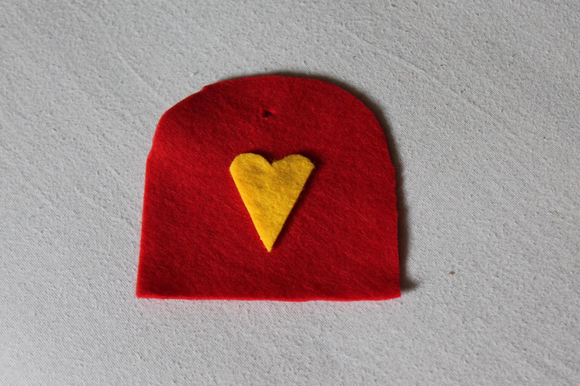 Créer ensuite sur une autre feuille de feutrine une étoile, un coeur ou tout autre dessin que vous souhaitez pour décorer la cape. Coller cette décoration sur la cape.