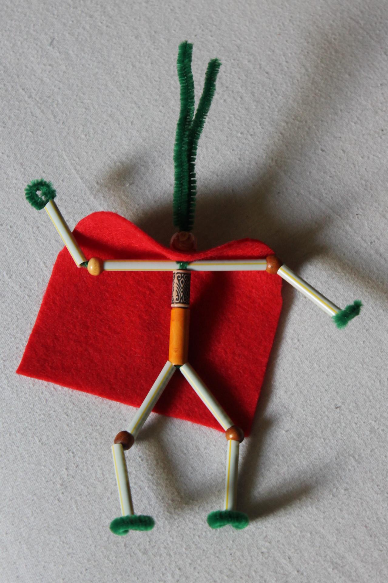 Passer les deux chenilles à travers la perle en bois/la tête (ou en pâte maïzéna) et enfiler les deux bouts de chenilles dans le trou de la tête.