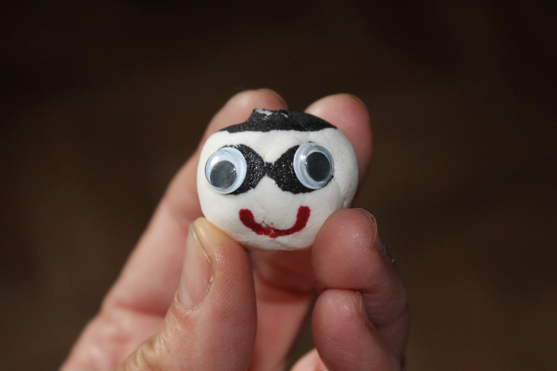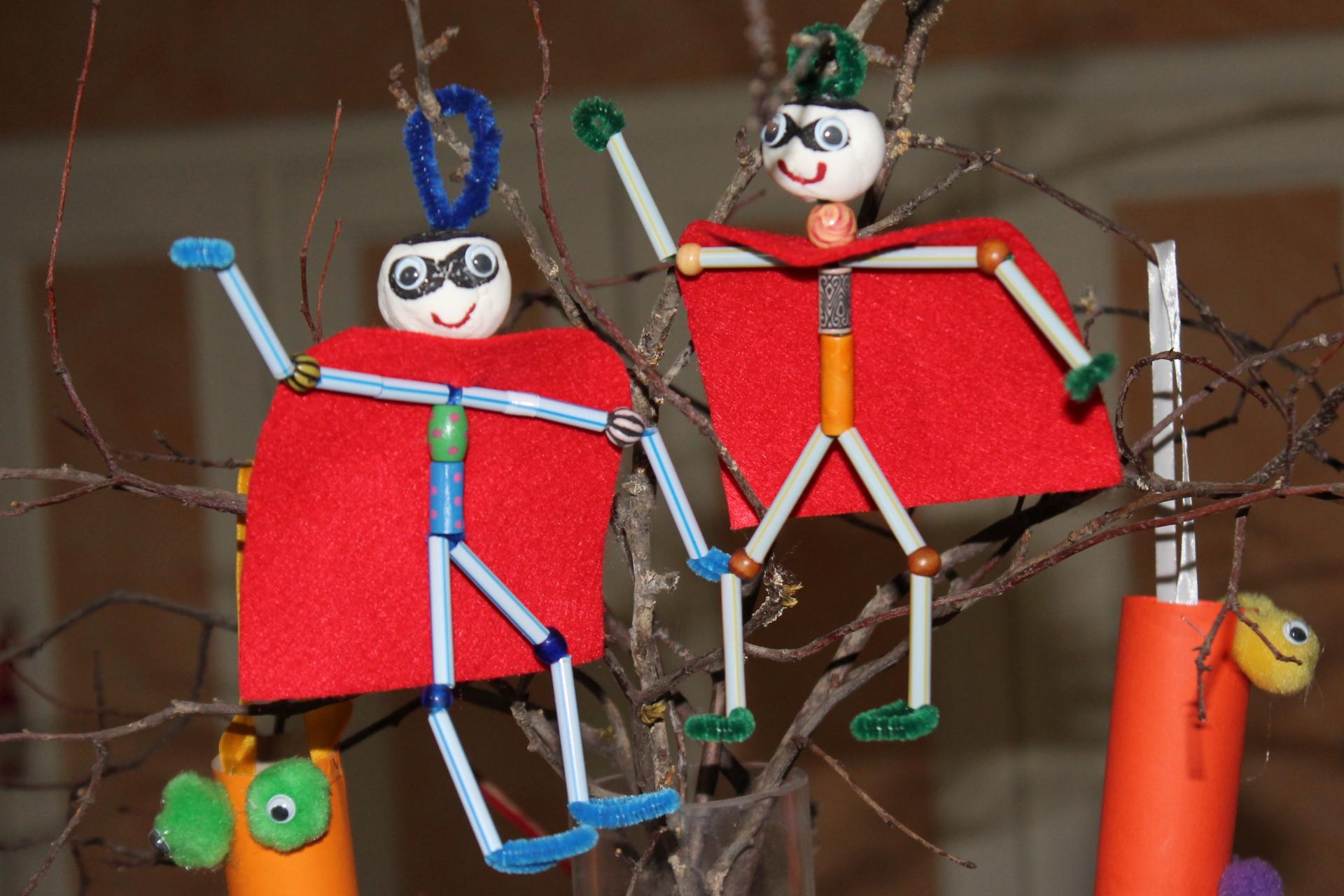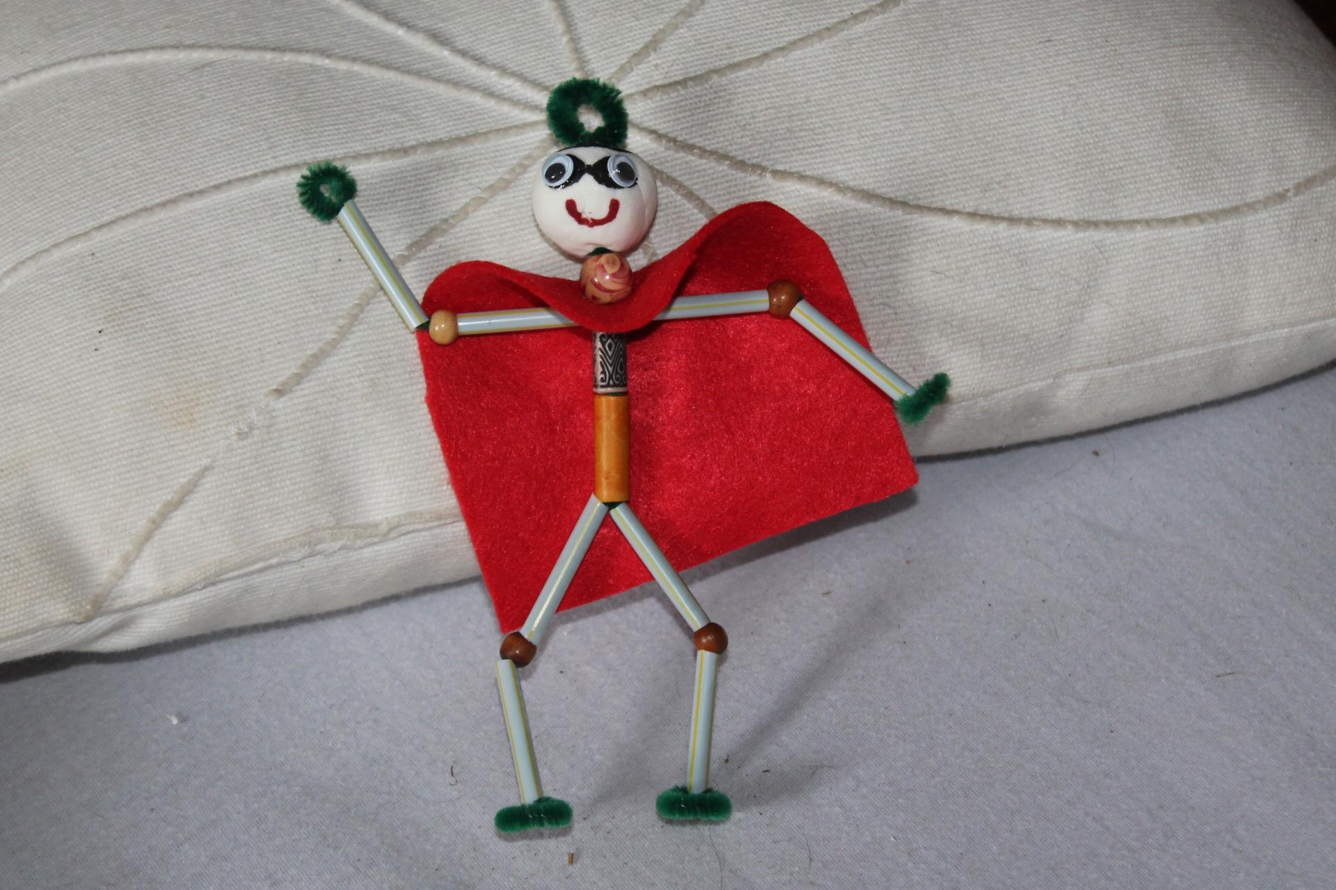 Avec des marqueurs permanents, dessiner les cheveux, le masque et la bouche du super-héros sur une perle en bois de 3 cm de diamètre ou bien sur une perle faite maison en pâte maïzéna (ne pas oublier de faire un trou dans la boule en enfonçant une paille de part et d'autre).