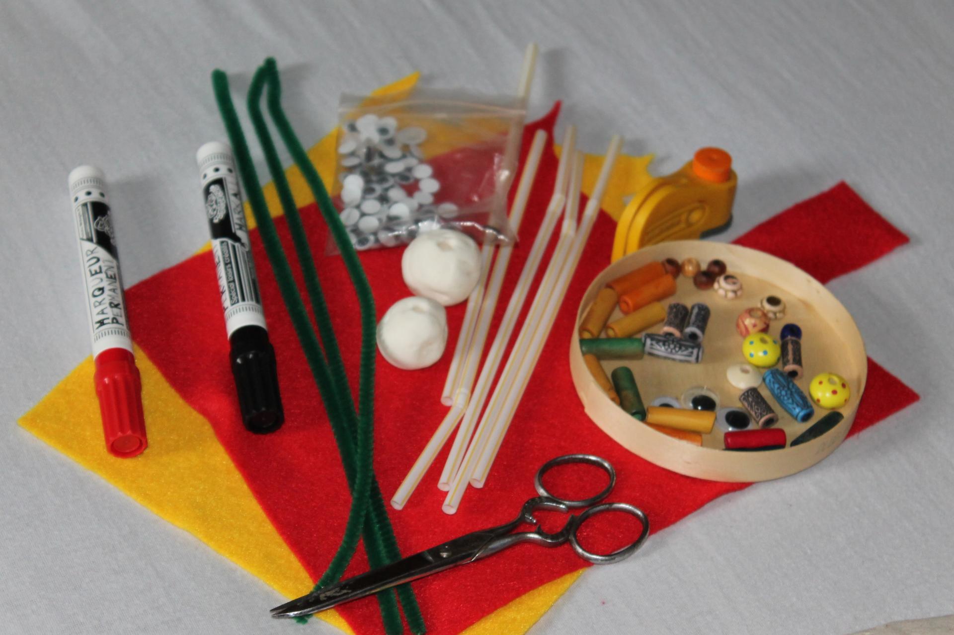 pailles, 3 chenilles de couleur assortie, des perles rondes en bois de 3 cm de diamètre (ou fabrication "maison" en pâte maïzéna à préparer à l'avance car les boules doivent sécher une journée), yeux mobiles, feutrine (de 2 couleurs assorties), perles en plastique à gros trous, marqueurs permanents, perforateur, ciseaux, règle plate, colle forte